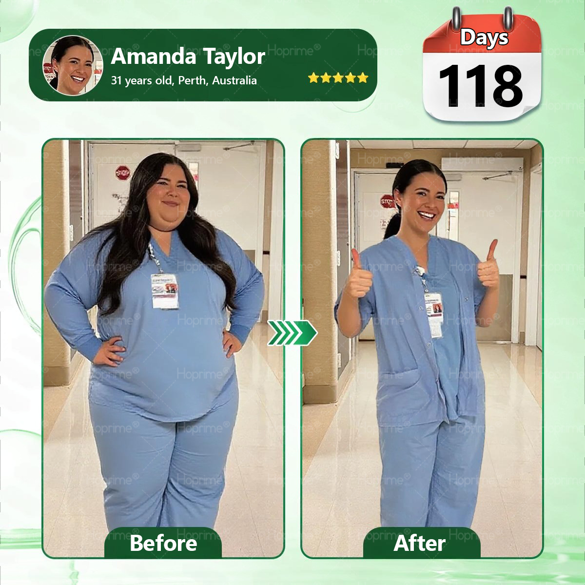 By month two, my energy was back. Started evening walks again. Four months laterโ77 kg pounds gone, down to 53 kg. My skin didn't get all saggy and loose like you'd expect from such rapid weight loss. I'm actually pretty satisfied with how tight everything stayed. I'm still nursing, but now I take care of myself too. I tell my patients struggling with weight: it's never too late to get your health back."ย โ Amanda Taylor,31 years old, Perth, Australia