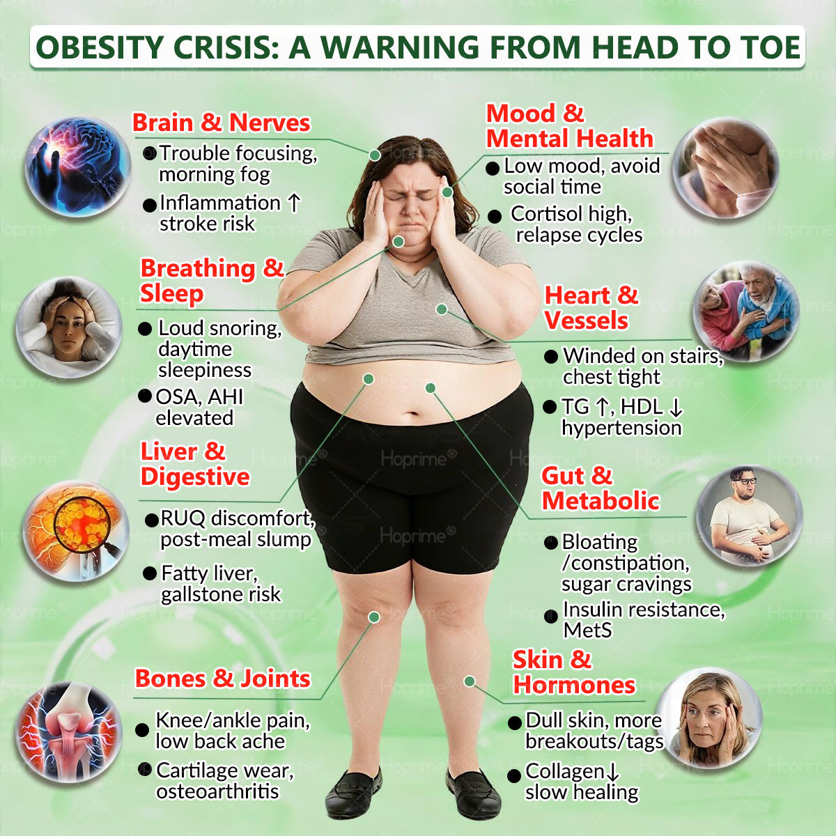 - Sleep apnea:ย Causes breathing interruptions and fatigue while increasing the risk of high blood pressure and heart disease.
